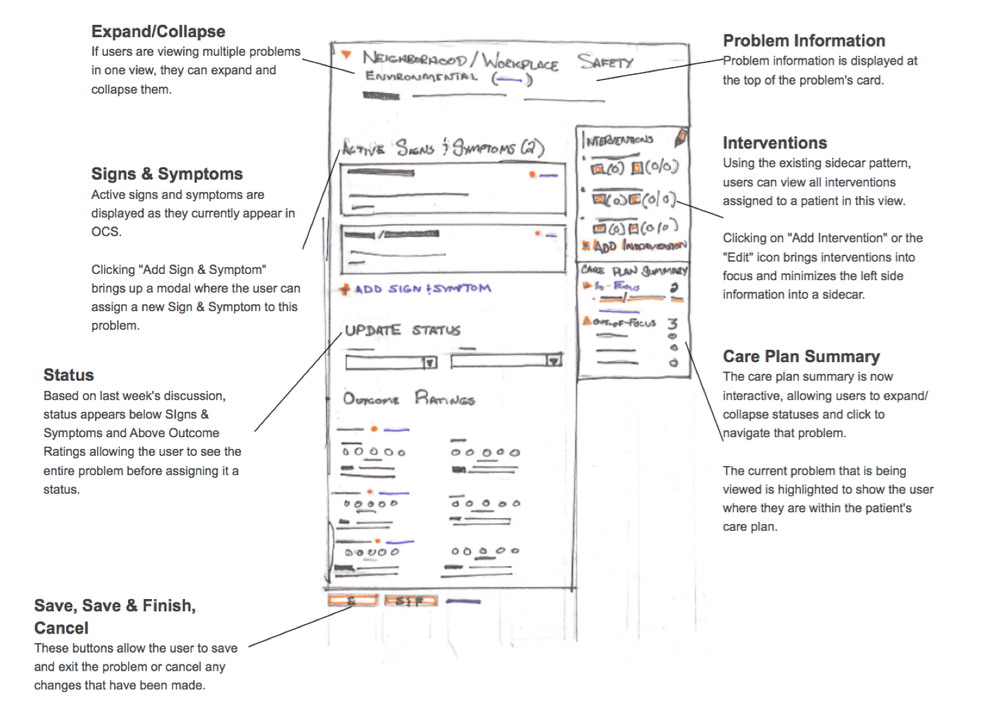 I was brought into a project mid-development to help provide a solution to a problem brought up during a review with clinicians. In this software, the clinician would be face to face or on the phone with a patient and would need to add or update existing problems and interventions that had been observed during the visit. The current system only allowed problems to be viewed and edited in a separate screen, forcing the user to keep the context of the problem in their head. It also didn't allow clinicians to add new problems while viewing the existing problems for the patient.